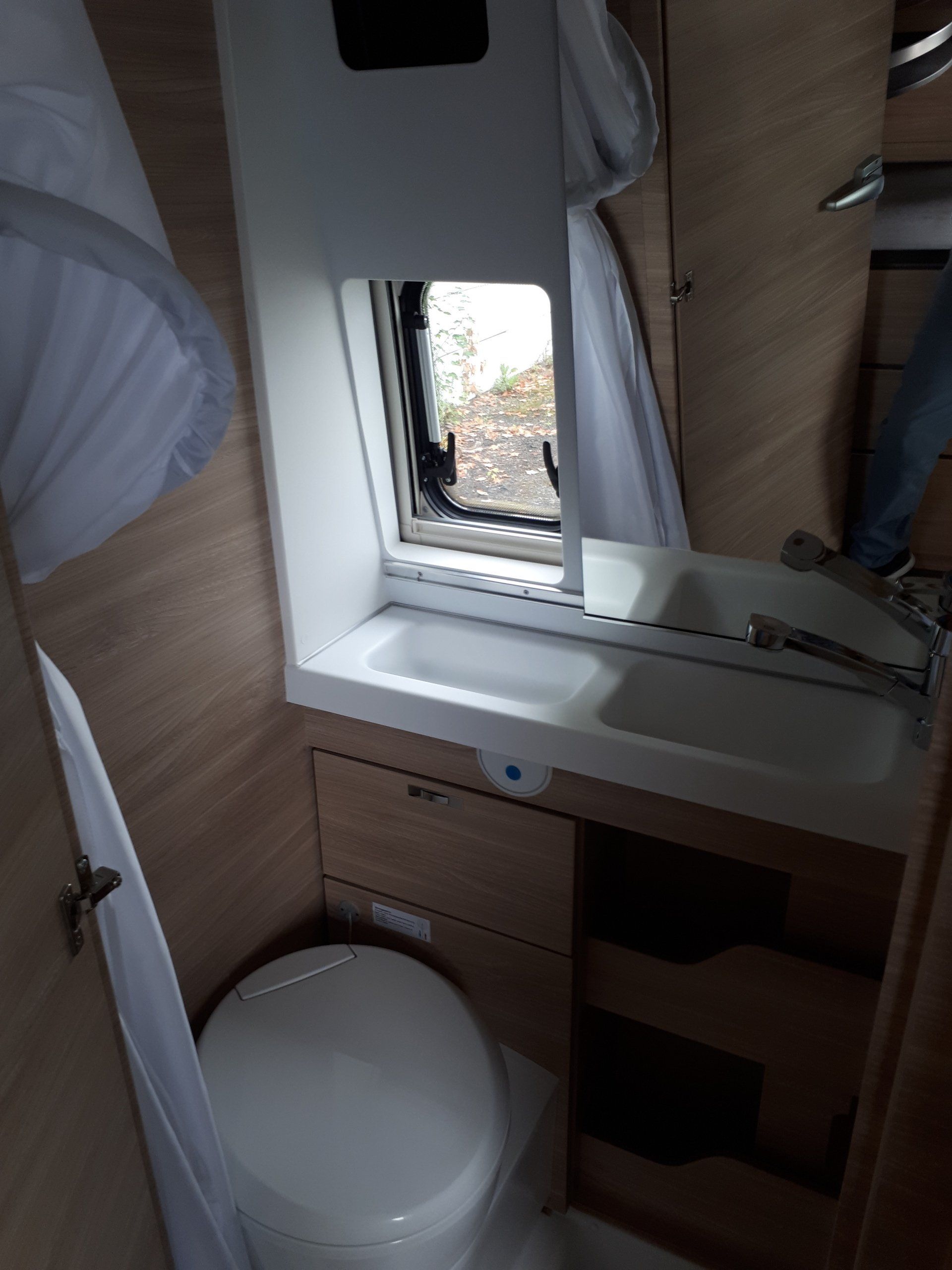 Das Waschbecken im Bad ist etwas klein geraten. Aber im VW Bus gab es gar kein Bad :-). Der Duschvorhang mit dem eingebauten Fahrradschlauch funktioniert ganz gut.